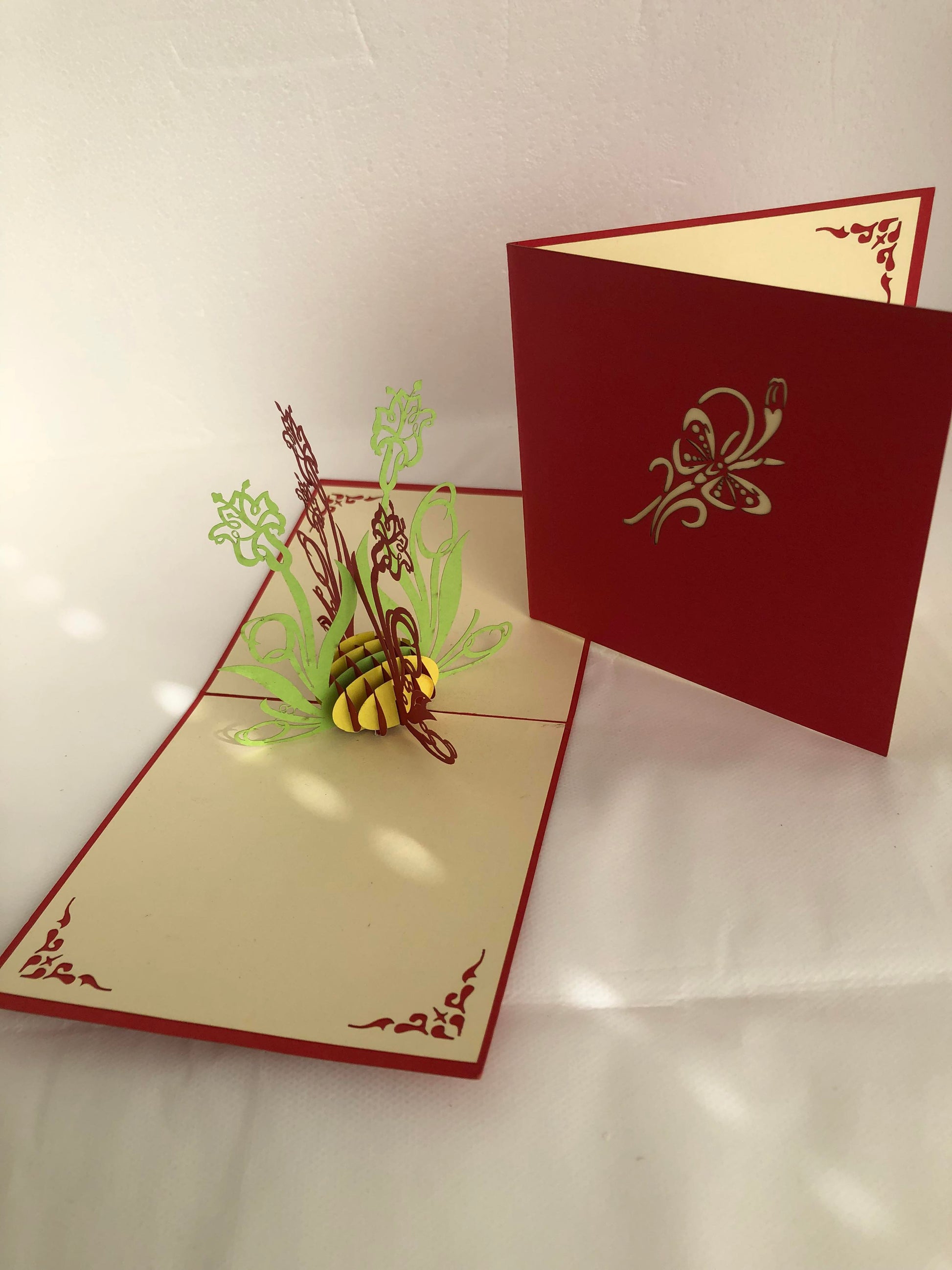 This 3D pop up card is cut with laser and folded, put together by hand. They come flat and just open up to become 3D, you don't have to do anything, just open the card.
