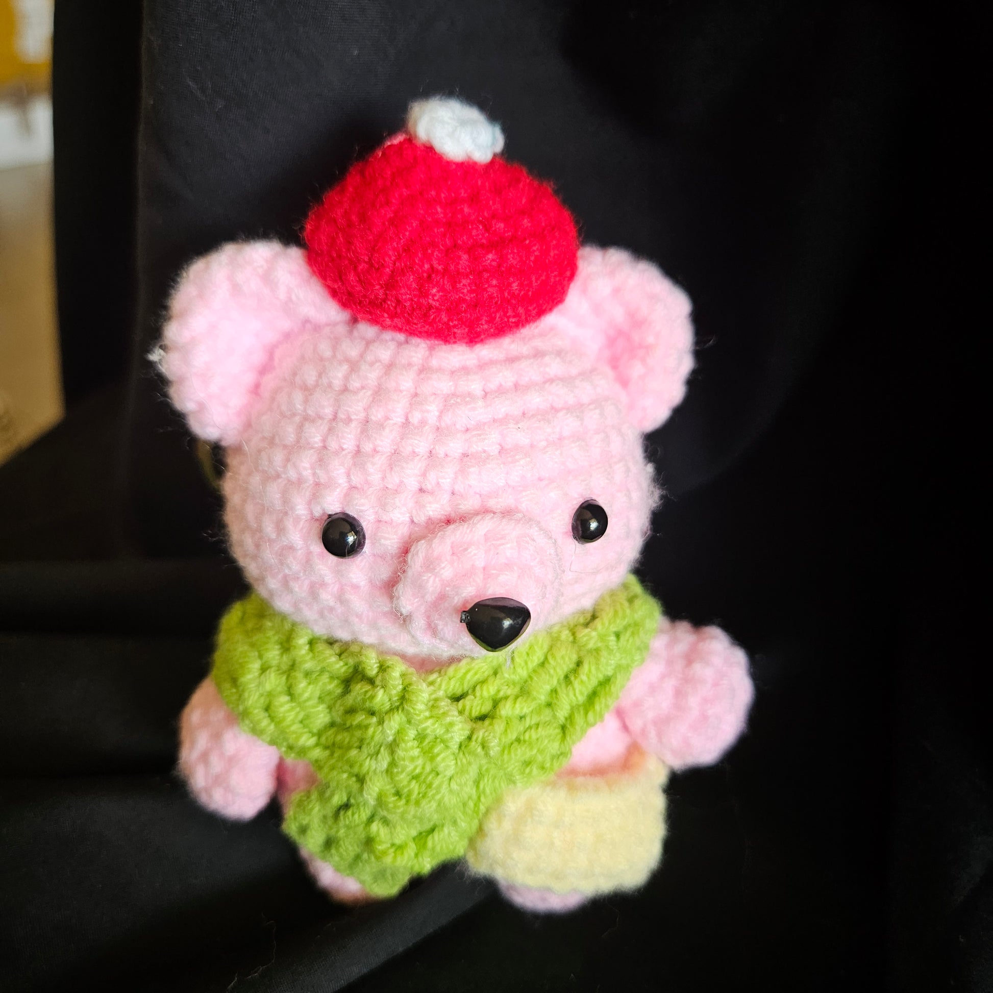 Cute, cosy, and full of charm, this handmade pink crochet bear keychain is the perfect little companion for keys, bags, or backpacks. Featuring soft pastel yarn, a cosy green scarf, and a sweet pom-pom hat, this adorable bear is sure to bring smiles wherever it goes.
