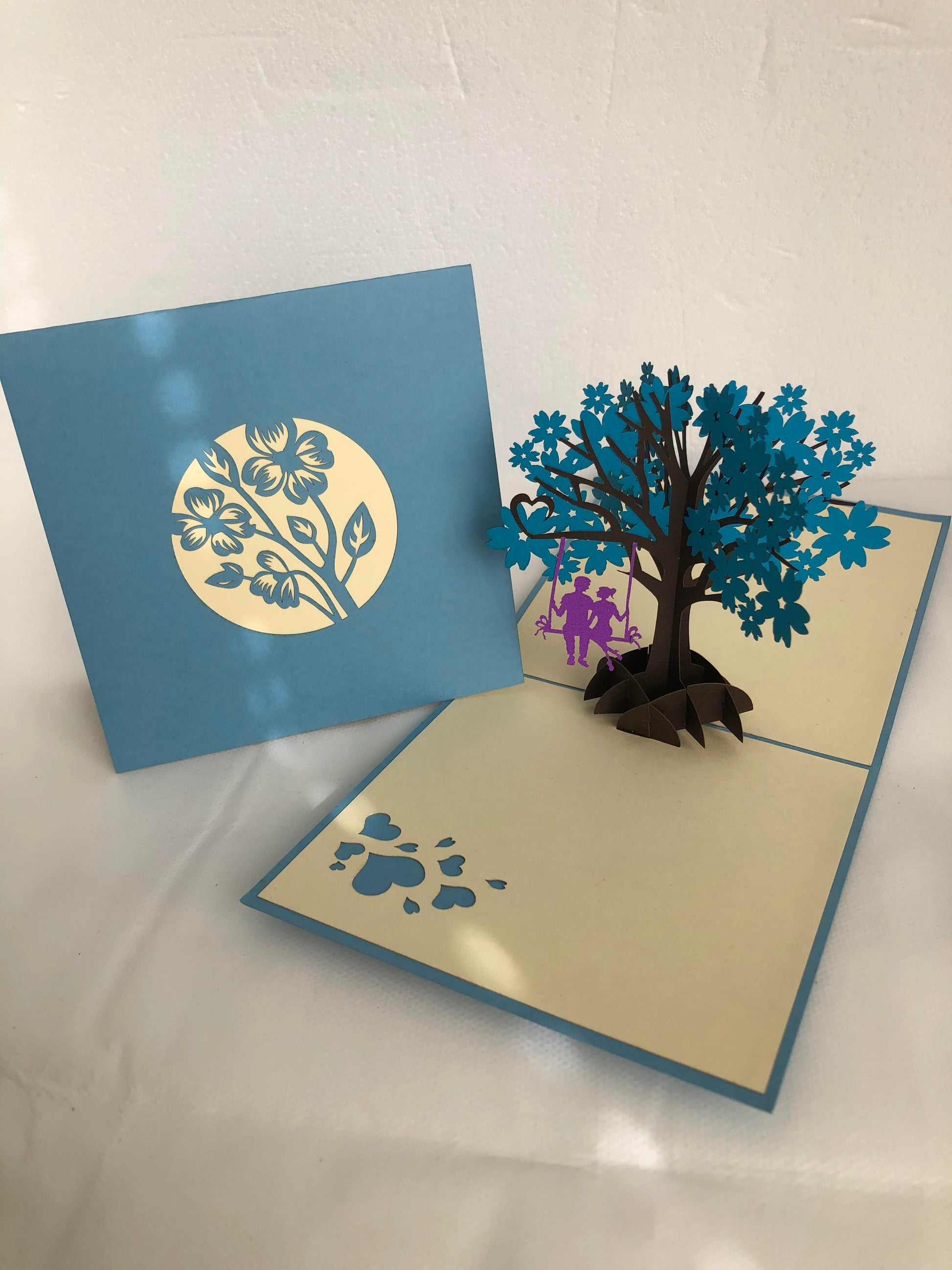This 3D pop up card is cut with laser and folded, put together by hand. They come flat and just open up to become 3D, you don't have to do anything, just open the card.